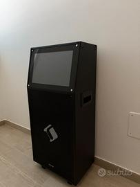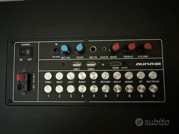 Cassa professionale wifi con impianto karaoke (2 microfoni a batteria) comodo trolley e display touch.subwoofer da 12″ riempie con bassi intensi, mentre l’alto da 3″e i 2 tweeter magnetici da 80 mm garantiscono uno spettro sonoro completo. Le diverse connessioni della cassa amplificata offrono il sound giusto, bluetooth,2 porte usb,sd o micro sd,cavo hdmi, un uscita aux e inoltre trasmette il segnale ad altri dispositivi audio wifi. La batteria è resistente,da 12 V/12 A e ha una durata da 3 a 5 ore,mentre con il cavo di rete incluso, si collega semplicemente alla rete elettrica.Ha la maniglia estensibile per trolley per consentire un trasporto comodo.