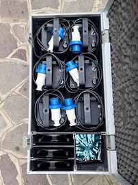 •2 Cavi multipolari a 6 canali ciascuno, totalmente indipendenti (2 prese per canale), lunghezza 15 metri cad (sezione cavo 16G1,5) ciascuno con connettori Harting (lato dimmer) e box a 12 prese volanti CEE, ip65 (lato fari)