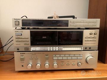 Impianto stereo vintage composto da ampli, registratore, tuner, giradischi e casse acustiche AR12 (le marche le vedete nelle foto), mobiletto per stereo con porta a vetro (escluso oggetti e libri al suo interno).