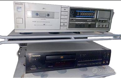 Impianto stereo composto da: 1) Compact disc player Pioneer PD-104 hi fi nero 2) Lettore cassette con registratore Philips FC141 3) Amplificatore Philips FA141 4) Stereo Philips FT141 5) Lettore dischi Sanyo TP 220 auto return belt drive 6) Casse Philips (2) Incluso mobile