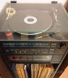 Impianto stereo Philips vintage con radio, giradischi audiocassette e 2 casse esterne. Completo di mobile su ruote e vano inferiore porta dischi.