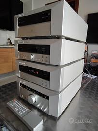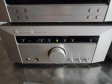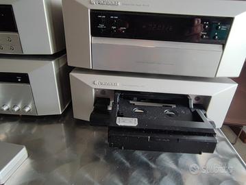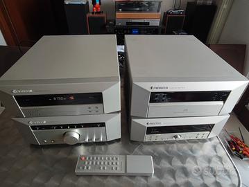 Vendo ottimo impianto stereo midsize pioneer della metà anni 90, le dimensioni sono le seguenti larghezza 26 profondità circa 33 altezza con tutti i 4 pezzi incolonnati 41 il tutto. In cm. Impianto appartenente alla serie Impresso e composto da amplificatore pioneer a-c5, tuner Pioneer f-c3, cassette deck pioneer t-c3, lettore CD pioneer pd-c5. Come detto impianto di dimensioni compatte da dal suono eccezionale ( ai tempi costava un botto). Tutti componenti separabili, collegabili con i tradizionali cavi RCA ( non come i piccoli impianti economici collegati tra di loro con flatcable ). Design molto ricercato con lati frontali smussati, il tutto funzionante tranne che la piastra cassette che apre il cassettino ma non funziona ( si sente il motorino girare, essendo auto reverse in un senso non succede nulla , nel senso inverso invece mangia il nastro)quindi ha bisogno di manutenzione. Dispone di ingresso phono e quindi possibile collegarci un giradischi. E' dotato di telecomando originale. Collegagli un buon paio di diffusori e rimarrai a bocca aperta per la qualità del suono. Degno competitore del Toshiba aurex system 15 , technics concise e aiwa serie 22. Si può vedere e provare al mio domicilio, preferirei non spedire. Astenersi problematici, indecisi e perdi tempo. Solo vendita diretta no tutto subito.