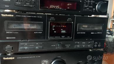 Impianto stereo coordinato, composto da: -Amplificatore SU X102 Super Class A Display Volume (viene visualizzato sul display la variazione della manopola volume) Super Bass Drive SEPARAZIONE SEZIONE PRE E FINALE Potenza di uscita: 40 watt per canale su 8Ω (stereo) Sensibilità di ingresso: 3 mV (giradischi), 150 mV (linea) Rapporto segnale/rumore: 73 dB (MM), 82 dB (linea) Separazione dei canali: 55 dB (linea) Dimensioni: 360 x 129 x 305 mm Peso: 5,3 kg --Lettore CD SL P28A -Registratore double cassette deck RS X102 Dolby noise reduction Autoreverse mode Tape edit speed Risposta in frequenza: da 30 Hz a 18 kHz (nastro in metallo) Rapporto segnale/rumore: 66 dB (dolby B) Wow e flutter: 0,1% Ingresso: 60 mV (linea) Uscita: 0,4 V (linea) Dimensioni: 360 x 129 x 285mm -Sintonizzatore ST X302L L'impianto è perfettamente funzionante, usato pochissimo. Unica piccola pecca: lo sportello di destra del registratore richiede un piccolo aiuto iniziale per aprirsi perchè l'ingranaggio è un pò rovinato, ma non incide sul regolare funzionamento DISPONIBILI SU RICHIESTA I DIFFUSORI DEDICATI Technics SB CS60 a 90 euro