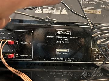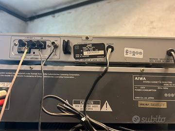 •Giradischi Si tratta di un modello della Panta, un marchio italiano degli anni '70 e ‘80 Il design con i tasti di controllo quadrati sul frontale è coerente con il modello Panta RPH 420. • Sintonizzatore (Tuner): Un sintonizzatore stereo JVC, identificabile dal logo sulla sinistra e dalla scala della sintonia analogica retroilluminata Modello JVC T-GX1L. •Piastra a Cassette Una piastra Aiwa, riconoscibile per il tipico design dei tasti a pianoforte e gli indicatori di livello a LED centrali Modello Aiwa AD-F250. • Amplificatore Un amplificatore integrato vintage con finitura in alluminio spazzolato e grandi manopole per il volume e la selezione degli ingressi. Modello Revac TA 5000
