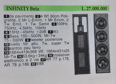 Vendo favoloso sistema casse stereo Infinity IRS Beta.Sistema HiFi a 5 vie di altissimo livello.Risposta in frequenza dai 15 hz ai 45.000 hz.Il sistema è riesce a riprodurre il messaggio sonoro, ove richiesto, grandi masse orchestrali, sinfonica ecc...,con una dinamica assolutamente impressionante, con trasparenza e realismo veramente ai massimi livelli attualmente raggiungibili.L'energia e l'impatto riprodotta nella sezione bassa e dettaglio e spazialità nella sezione medio-alta, non ha rivali , il tutto ovviamente se pilotato da amplificazioni di livello adeguato e in un ambiente idoneo.Si interfaccia con amplificazioni di riferimento come Mark levinson, krell, Passlab, Threshold, Audioresearch, Aloia, Counterpoint, Audio analog, Burmester, Plinius, Sugden, Balance Audio Technology , Sonic Frontiers ecc...e Il sistema è indicato ad utenti estremamente esigenti e non ad ascoltatori improvvisati...Richiede attenzione e competenza ma ma una volta sistemato a dovere restituisce incredibili e davvero impareggiabili emozioni di ascolto.Uno degli ultimi modelli prodotti, appartenente all'ultima serie la G. Disponibile per qualsiasi chiarimento. preferito contatto telefonico, e grazie per aver visualizzato. 3245425343.