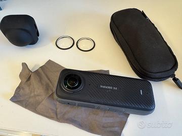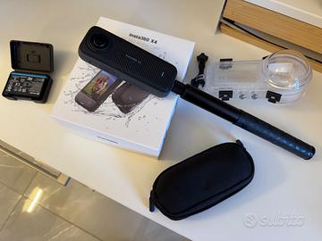 Insta 360X4 con scatola originale, selfie stick, una batteria extra, diving case usata una sola volta. La fotocamera e' stata usata pochissimo e la vendo perchè ho fatto un upgrade per X5. La fotocamera ha anche le protezioni per le lenti originali, la custodia in neoprene e la custodia per le lenti in gomma. La scheda SD NON E' INCLUSA.