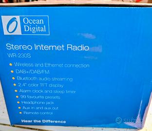Stereo Internet Radio Ocean Digital Modello WR-230SF Oggetto nuovo ancora in scatola, mai utilizzato Radio internet con più di 30.000 stazioni Radio FM Bluetooth e WiFi Ingresso Aux e uscito audio Uscita cuffie Presa di rete RJ45 (uPnP/Dlna) Display a colori 150 stazioni memorizzabili Telecomando Scambio a mano in zona Monza e Brianza con pagamento in contanti