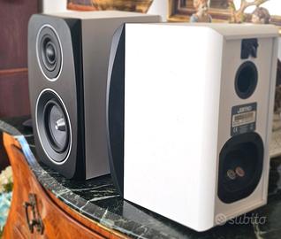 Vendo coppia di diffusori bookshelf Jamo Concert C91. Le Jamo C91 fanno parte della serie Concert 9 del produttore danese, e condividono le tecnologie dei diffusori da stand C93 e C103. Disegnato da Kieron Dunk, Jamo C91, propone un deflettore anteriore più largo del mobile, ed adopera un sistema bass reflex a 2 vie, con un mid-woofer (Hybrid Composition Conical Cone) da 4 pollici e un tweeter al neodimio disaccoppiato da 1 pollice. Questi speakers possono essere adoperati appesi alla parete con sistema a gancio. I diffusori sono in perfette condizioni tecniche, e mostrano normali segni di utilizzo nel mobile. Non possiedo la confezione originale, ma posso spedire con imballo protetto. Contattatemi per maggiori informazioni. SPECIFICHE: Gestione della potenza (Watts Long / Short Term) 100/150 Amplificatore consigliato 50W Impedenza 6 Ohm Risposta in frequenza (Hz, +/- 3dB) 65Hz - 24kHz Sensibilità (dB, 2.8V / 1m) 86dB Woofer (mm / pollici) 101.6/ 4 Tipo di sistema Bass Reflex 2 vie Tweeter (mm / pollici ) 25/1 neodimio Dimensioni del prodotto (cm altezza x larghezza x profondità) 26,5 x 17,5 x 19 Peso 1 diffusore (Kg ) 4.1