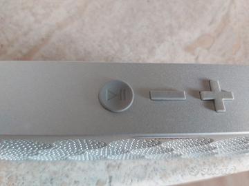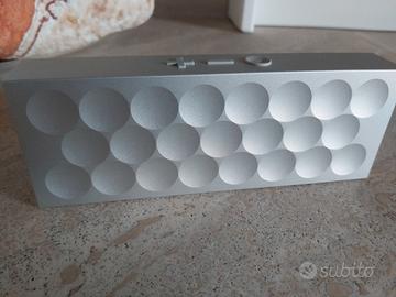 Jawbone Mini Jambox, un sistema di altoparlanti portatili wireless Bluetooth che unisce un design elegante a un suono potente. Cassa di forma rettangolare è rifinito in una raffinata colorazione argento. Compatibile con un'ampia gamma di dispositivi grazie alla connettività Bluetooth universale, è perfetto per tutte le tue esigenze audio in movimento, per la riproduzione di musica, oppure da utilizzare come viva voce per telefono. Jawbone Mini Jambox non offre solo un suono eccezionale, ma è anche progettato pensando alla praticità. Goditi la libertà dello streaming wireless, insieme a funzionalità come un microfono integrato per chiamate nitide e un jack di ingresso per una connettività aggiuntiva. Il controllo del volume è facilmente accessibile, permettendoti di regolare la tua esperienza di ascolto senza perdere un colpo. Viene fornito di cavo di ricarica USB.
