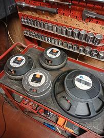 vendo n° 14 altoparlanti 15 pollici 8 ohm jbl e 140 perfettamente funzionanti mai riparati -riconati o altre riparazioni usati pochissimo-- n6 trombe 2350 con adattatori2328 (on jbl usa copia sudamericana) n4 jblw 115 8a magnete ceramico