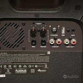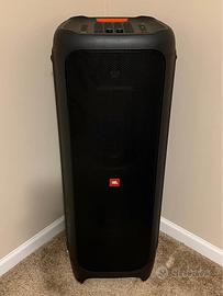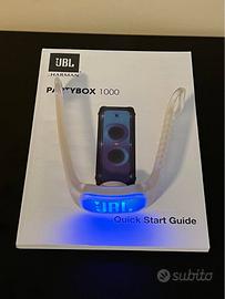 Potente altoparlante JBL PartyBox. Ha uno spettacolare gioco di luci, cambia colori. Ottimo per feste o semplicemente per rilassarsi. Si connette tramite Bluetooth, AUX, USB. Offre un suono potente. Include un braccialetto Air Gesture e un manuale