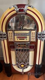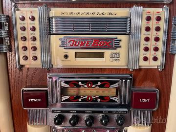 JUKE-BOX stereo-radio e CD in legno con luci incorporate quando è acceso Misure: larghezza 55cm - altezza 102 cm. - profondità 28 cm.
