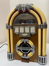 Radio Juke Box anni 80 marca ALFA TRONIC mod. JB02. La forma a cupola ed il frontale con le sembianze di un vecchio juke box americano. Condizioni stupende e perfettamente funzionante con un'ottima acustica. All'accensione della radio si illumina anche la parte trasparente anteriore. Nel retro è posizionato un'interruttore che alimenta ed accende le luci della parte periferica. Alimentazione a rete. Le misure in cm sono 28 x 20 x 14. Prezzo trattabile.