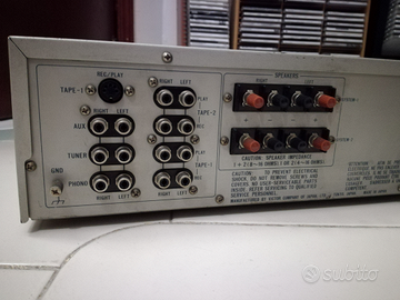 Ospita due coppie di diffusori anche separatamente, tasto mono, ingresso phono, 35 watt x canale, picco Led fino a 80 watt. Completamente in alluminio e componenti originali Elna.