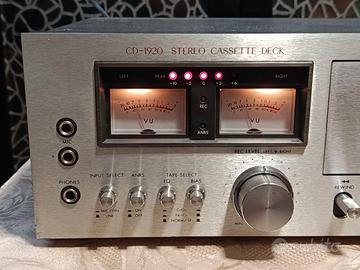 Vendo piastra a cassette stereo tape deck 2 testine JVC CD-1920 in buone condizioni, perfettamente funzionante, Hi-Fi vintage anni '70. Effettuata la sostituzione delle cinghie di trazione In caso di spedizione non utilizzo il servizio di tuttosubito. Accetto altro pagamento con video dimostrativo del funzionamento Caratteristiche: -Anno di produzione: 1976 -Sistema: 2 Testine, 1 Motore -Tecnologia Dolby System - ANRS (Automatic Noise Reduction System) -Frontale: alluminio lucente con scritte nere -Vano cassetta stabilizzato con meccanismo apertura basculante protezione testine -Contagiri e tastiera comando sono completamente meccaniche -Ingresso frontale per cuffia tramite jack da 3,5mm -Ingressi frontali per microfono L + R tramite jack da 3,5mm -Ingresso posteriore RCA (Line-In) -Uscita posteriore RCA (Line-Out) -Tipo di nastro: (normale tipo I, CrO2 - biossido di cromo tipo II, Fe-Cr - ferrocromo tipo III) -Velocità: 4,76 cm/s -Testine: 2 - 1 (Cronios Head) x riproduzione / registrazione , 1 (Ferrite Head) x cancellare -Motori: 1 Ectronically Goverened DC -Configurazione delle tracce: 4 tracce - 2 canali stereo -Risposta di frequenza: 20 - 18.000Hz +3db -Rapporto S/N: 52db (senza dolby), 62db (con dolby) -Wow & Flutter: 0,09% -Tecnologia Dolby System ANRS (Automatic Noise Reduction System) -Selettore "Input Select" (Mic/Din / Line) Selettore "ANSR" (On / Off) -Selettori "Tape Select Eq - Bias" Normal / CrO2 / Fe-Cr (imposta il tipo di cassetta utilizzata) -Selettore "Timer" (Rec / Off / Play) -Regolazione volume di intensita del segnale in entrata - uscita e bilanciamento tramite le apposite manopole -Indicatori Vu-Meter analogici ad ago retroilluminati e digitale a led per misurare l'intensita del segnale -Dimensioni: L-39cm x H-15.1cm x P-32.1cm -Peso: 7.2Kg Per informazioni non esitate a contattare Eventuale spedizione in TUTTA ITALIA CD 1920 CD1920