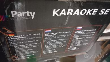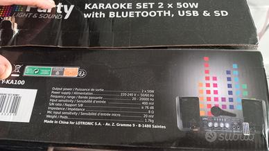 una scatola contenente un amplificatore 50 watt per canale si può collegare anche in auto grazie alla presa 12 volt 1 microfono . 2 casse 1 telecomando caratteristiche presa aux. usb. sd. radio blutoot . insomma cos'altro ci vuole per essere completo, nuovo di zecca
