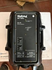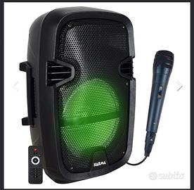 vendo coppia di casse karma ricaricabili a batteria da 8 pollici una potenza 80 W l’una i diffusori non hanno bisogno di cavi una volta caricate le batterie. La prima cassa trasmette via Wi-Fi il segnale alla seconda sulla prima cassa è presente un mix Eno a un canale con un microfono dedicato un lettore MP3 a pennetta collegamento Bluetooth con il telefono radio FM e Canale ausiliario per l’inserimento di qualunque tipo di strumento musicale si voglia adottare ottimo per feste per bambini oppure artisti di strada prezzo richiesto 195 € materiale nuovo