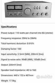 non effettuo vendite a utenti privi di referenze (appena iscritti senza recensioni e vendite effettuate) solo se pag. con bonif. istant. Potenza in uscita: 110 Watt per canale su 8 Ohm (RMS, 20Hz - 20kHz). Risposta in frequenza: Da DC a 400 kHz (+0 / -3dB). Distorsione Armonica Totale (THD): 0,01% alla potenza nominale. Fattore di smorzamento: 100 (a 8 Ohm). Peso: Circa 17,5 kg (38,5 lbs), una testimonianza della robustezza dei trasformatori e del telaio Costruzione Dual Mono: Utilizza alimentazioni separate per i canali destro e sinistro, migliorando drasticamente la separazione dei canali e la dinamica. Estetica: presenta un pannello frontale in alluminio spazzolato con due grandi indicatori VU meter analogici per la potenza di picco. Connettività: Dispone di due ingressi Phono (MM), un ingresso Tuner, un ingresso AUX e due loop per Tape. È inoltre dotato di selettori per la modalità (Stereo/Mono/Reverse) e di un attenuatore di volume (0dB, -15dB, -30dB) TENUTO DA AMATORE