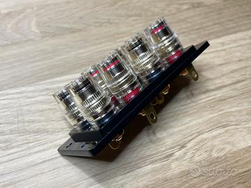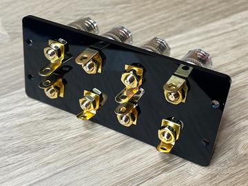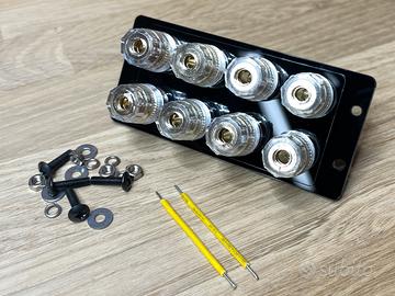 Questa che ho realizzato (in materiale acrilico con taglio laser) è la soluzione che permette la connessione con cavo spellato, terminale a forcella e spine banana da 4mm