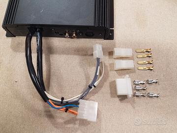 Amplificatore modello KAC-622, da 30W stereo su 4 ohm, oppure 80w mono (con commutatore), ingresso prese rca oppure spinotto din dedicato Kenwood, potenziometro per regolare sensibilità di input; da 0,1 volt a 5,0 volt, adattabile a qualsiasi autoradio con uscita pre-out, il connettore cavi era difettoso ed abbiamo optato per la saldatura diretta dei cavi e fatto un connettore apposito, si consegna anche il connettore di collegamento da preparare per l'impianto. Testato e funzionante. Possibilmente consegna a mano. € 30