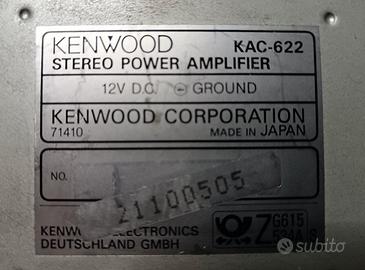 Vendo amplificatore Kenwood modello KAC-622 stereo 60 watt per canale ingresso prese rca oppure spinotto din dedicato Kenwood potenziometro per regolare sensibilità di input da 0,1 volt a 5,0 volt, Testato e funzionante.