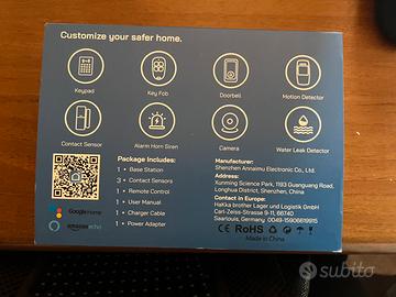 Vendo kit allarme wireless (quindi senza fili) gestibile anche via app da remoto (app smarthome) con modulo comando e sirena integrata (ricaricabile con una semplice presa micro usb), telecomando, 3 sensori per porte/finestre (mai usati), telecomando e 4 sensori pir.