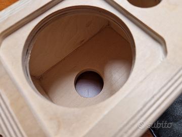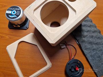 Piccolo kit da autocostruzione in legno preassemblato Ciare composto da 2 cabinet in legno, 2 telaio portatela + tela, 2 woofer 10cm schermati, 2 Tweeter, 2 vaschette terminali con filtro, materiale fonoassorbente, accessori per il montaggio e istruzioni.