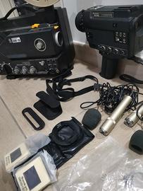 Cinepresa Sankyo Sound XL 600 S, con buona estetica e ottica, con 3 microfoni (Jack singolo, Jack doppio per comando remoto e telescopico con manuale, supporto R-32, guida pellicola, 2 cappucci mic usati, ecc.), cavo DIN di sincronizzazione, tappo copri-ottica. Proiettore Sankyo Sound 700 (modello sonoro) con libretto istruzione originale Kit Effetti Speciali: Macro Titler + 9 Filtri Macro Focus (bustine sigillate) e custodia in pelle. Accessori di Precisione: Tutte le bustine originali (2 Lampadine a filetto, 1 Tripod Pad, 4 Gommini, 1 Cavo DIN). Cuffie Monitor & Tracolla (In bustina originale) Alimentatore originale.