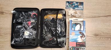 Vendo kit Action Cam completo di tutti gli accessori per il fissaggio della videocamera in diverse soluzioni, casco, MTB, windsurf, ecc. bretelle per il fissaggio sul corpo, ventosa, bastone per selfie,adesi di fissaggio e altro ancora.