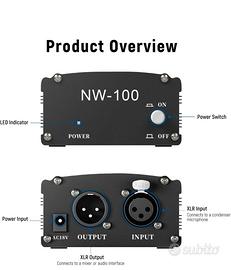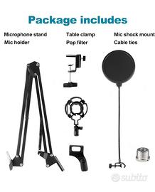 (1) Microfono a Condensatore, (1) Regolabile Stand Asta di Sospensione, (1) Serratura da Tavolo, (1) Supporto Anti-vibrazione in Metallo, (1) Filtro Pop, (1) Antivento Sferico in Spugna, (1) Cavo 3,5mm Maschio a XLR Femmina, (1) scheda audio in OMAGGIO (1) 48V Phantom + cavi e alimentazione