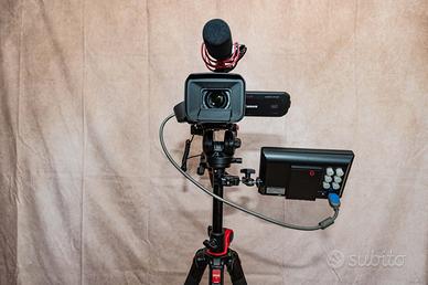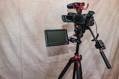 Videocamera in condizioni spettacolari, due anni e mezzo di vita. Strumento professionale con sensore di un pollice, due slot di memoria, 4K, presa per collegamento strumenti pro e tante altre caratteristiche importanti reperibili in rete. Viene fornita di uno stativo professionale con testa fluida e ampia leva di comando, inoltre con diverse configurazioni. Poi un monitor della Lilliput (vetusto ma ancora perfettamente funzionante e con batteria che supera le 3 ore). Microfono Rode, telecomando a pulsantiera collegabile alla leva dello stativo, infine tre batterie, cavistica varia, cavo hdmi, supporto monitor, carica batterie e cavo alimentazione continua. Come detto ,a macchina ha 2 anni e mezzo ed è stata usata pochissimo, max 15 ore di girato: 3 eventi l'anno: due di pattinaggio indoor ed un concerto. E' costata 1800 euro, senza contare il resto del kit. Ovviamente non spedisco poichè il kit dovrà essere provato in tutte le sue parti. tel. 3491778370.