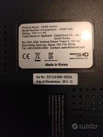 Splitter HDMI DigitalZone (mod. HDMI 104L) per inviare il segnale video da una singola sorgente (es. Sky, PlayStation, PC) a quattro uscite separate (es. 4 TV o monitor) in contemporanea.