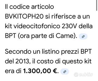 Kit monofamiliare con pulsantiera predisposta per il bifamiliare nuovo a colori marca BPT cod. KIT BVKITOPH20
