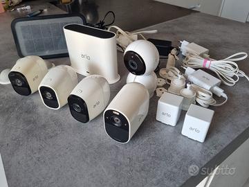 sistema completo di 5 videocamere wi-fi per sorveglianza. Le telecamere sono a batteria o pannello solare o alimentazione diretta. Tutto gestibile con app Arlo, registrano su cloud o su usb. kit composto da: -2 telecamere arlo pro da esterno (una con batteria da sostituire o da usare con alimentazione diretta) -telecamera arlo pro2 da esterno -telecamera arlo essential da esterno -telecamera da interno arlo baby -pannello solare originale arlo -base hub arlo - 3 caricatori e cavo -vari sistemi di aggancio Tutto funzionante. Non spedisco.