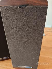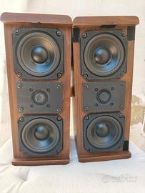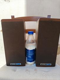 Coppia di casse acustiche hi-fi di costruzione robusta (fatte a Milwaukee, Wisconsin) e compatta, ideale per inserimento in una libreria. A dispetto delle dimensioni possono sonorizzare una stanza di media grandezza senza problemi. Furono acquistate negli USA, e non credo siano mai state distribuite in Europa. Garantisco il perfetto funzionamento, le condizioni estetiche sono più che buone ma segnalo un minuscolo strappo sulla tela di una cassa, visibile in foto. Per la loro costruzione simmetrica, le casse possono essere usate sia capovolte che disposte in orizzontale. Altezza 33 larghezza 13,5 profondità 14,5