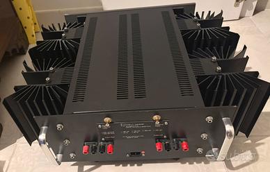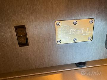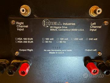 Misure in cm: 41 larghezza chassis; 59 larghezza totale (comprensiva delle alette di raffreddamento laterali); 25 altezza; 50 profondita’. Il suono del KSA 100 è eccezionalmente neutro, esteso nelle note basse con grande controllo dei woofer di qualsiasi diffusore. La gamma medio alta e’ cristallina e mai aggressiva. Riesce a ricostruire la scena sonora con grande realismo e non ha bisogno di essere spinto nel vattaggio per restituire una gamma completa. La capacita’ di pilotaggio di diffusori a bassa impedenza e’ assicurara dalla riserva di potenza disponibile: 100 watt su 8 ohm in coasse A pura, fino a ben 800 watt su 1 ohm. Nota tecnico-costruttiva per gli audiofili che non conoscono l’apparecchio: trattasi del modello KSA100 (senza suffisso, quindi da intendersi mk1) con la circuitazione tradizionale cablata e le alette di raffreddamento. Al contrario, il modello KSA 100 mk2 non ha circuitazione in aria, ne’ cablaggio, ne’ alette laterali di raffreddamento. Il modello Mk2 e’ costruito con due circuiti stampati (printed board) raffreddati direttamente da 2 ventole, tipo matherboard dei computer. ********** Descrizione estratta dal web: Il KSA 100 e’ noto per le sue capacità di pilotaggio, essendo dotato di notevole potenza, 100 watt in pura classe A su 8 ohm per canale, 200w su 4ohm, 400w su 2ohm, 800w su 1ohm. Punti di forza sono la capacità di pilotaggio, la grande energia, il rigore di cui è dotato questo amplificatore sono ancora un riferimento.