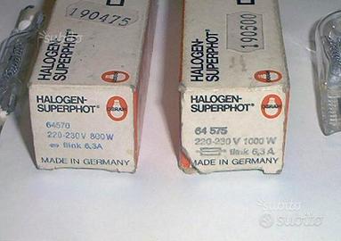 Sono 2 lampade alogene della Osram, serie: "halogen superphot". Le lampade sono nuove mai usate, ancora nelle loro confezioni originali. Caratteristiche: - 220-230V 800W - 220-230V 1000W Vendo anche singolarmente al prezzo di 16€