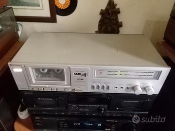 Lettore a cassetta singola marca Hitachi(Japan) modello D-E25. Anno produzione 1981, totalmente assemblata in Giappone, quindi qualita' assoluta dei componenti garantita. Stereo a 4 tracce 2 canali, velocita' nastro nella norma, 4,75 centimetri al secondo, 3 testine 1 x combinazione registrazione, 1 x riproduzione 1 x cancellazione. 2 motori uno servo CC, 1 CC, legge e registra tutti i tipi di nastri anche Metal con riduttore di rumore Dolby B NR. Risposta in frequenza da 20Hz a 21Khz. Rapporto segnale rumore 69DB(Dolby B) Wow e Flutter 0,038%, distorsione armonica totale 0,8%, ingresso 60mV linea, 0,3mV microfono. A prima vista sembra di aspetto anonimo come fosse di quelle messe in un impianto completo, cioe' una buona piastra e nulla piu'. E' tutto il contrario. E' una bomba di tecnologia assoluta per l'epoca Vintage di allora per le piastre. Intanto possiede un circuito integrato sviluppato solo dagli ingegneri dell'Hitachi che controlla la fluidita' del nastro e altre funzioni automatiche. In piu' e' a semiconduttori. Non quelli di adesso, tutti ragruppati in schede cinesi fasulle. Tutti separati, 1 x modulo, 6 x circuiti integrati, 2 FET, 34 transistors! 41 diodi! 3 LED. In ultimo ha un livello di uscita di 500mV altissimo, presente cosi alto solo negli Amplificatori Marantz stesso periodo, vedi PM500, PM510DC. Quindi all'ascolto se registrato da un disco sentite sempre in analogico ma con una dinamica equivalente ai lettori CD dei migliori. Totalmente ricontrollato in ogni sua parte, sostituite tutte le cinghie, estetica come da foto reali, pari al nuovo, acceso e in funzione, quasto, lo vendono a 102 euro, si spedisce.