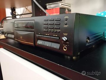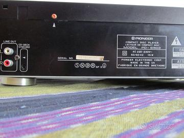 LETTORE CD PIONEER PD-S503. MADE IN ENGLAND .INGHILTERRA. COMPLETO DI TELECOMANDO NUOVO..FA TUTTE LE SUE FUNZIONI. Meccanica rovesciata. Perfettamente funzionante Meccanismo laser completamente Revisionato Testato con CD di prova speciali Nessuna interruzione, anche durante operazioni di lettura e ricerca impegnative Tracciamento laser stabile e buona correzione degli errori: riproduzione senza problemi, anche in caso di lievi urti e vibrazioni tipiche della superficie su cui è appoggiato Telecomando di ricambio di qualità superiore (nuovo, fa tutte le funzioni principali) Caratteristiche: Funzione di riproduzione casuale Funzione di ripetizione Uscita cuffie regolabile Tastierino numerico a 10 tasti per la selezione diretta dei brani Meccanismo del piatto stabile per una rotazione costante del CD Risposta in frequenza: 2 Hz - 20 kHz (± 1 dB) Rapporto segnale/rumore: 106 dB Gamma dinamica: 96 dB Distorsione armonica totale: 0,003% Connessioni: 1 x 6,3 mm Jack 1 x analogico (RCA) 1 x sincronizzatore per lettore CD Formato disco: CD Convertitori digitale: PD2029A Meccanismo CD: PEA1179 Risposta in frequenza: da 2 Hz a 20 kHz Gamma dinamica: 96 dB Rapporto segnale/rumore: 106 dB Distorsione armonica totale: 0,003% Uscita di linea: 2 V Dimensioni: 420 x 286 x 116 mm Peso: 4 kg. Poco trattabile