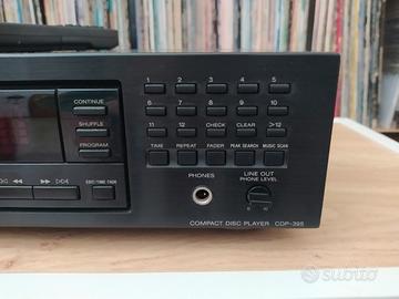 Lettore CD Sony CDP-395. Ottimo lettore, molto affidabile e molto silenzioso. Tempi di accesso ai brani rapidi. Funzionamento eccellente. Pochissimi segni di utilizzo dovuti all'età. Un solo proprietario. A scelta due tipi di telecomandi. Si vende nella forma visto e piaciuto senza garanzia e possibilità di reso. Imballo accurato a prova di corriere maldestro.