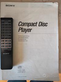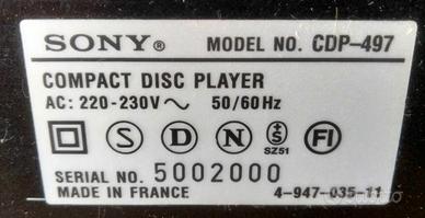 Lettore di cd compact disk, marca Sony, CDP-497. Player munito di telecomando e libretto di istruzioni. Eccellente qualità del suono. Perfette condizioni, vendo soltanto perché era nella mia casa al mare che ho venduto, mentre a Roma ho un altro impianto hi-fi.