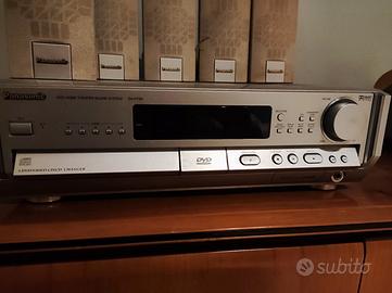 Sistema home cinema, home theater con lettore DVD a 5 DVD. Dolby digital Surround 5.1 e sintoamplificatore radio am ed fm. 178W. Telecomando presente ma non funzionante.