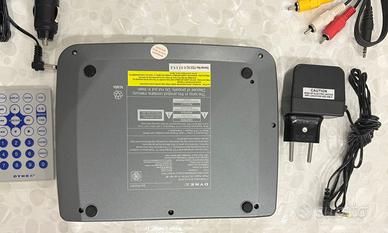 Lettore DVD portatile DYNEX, di 7 pollici. Ha un altoparlante integrato, un jack dedicato alle cuffie e un jack di ingresso e uscita AV, un cavo di alimentazione AV, un adattatore di alimentazione, un adattatore di alimentazione per l'auto e custodia. cm.20xcm.15