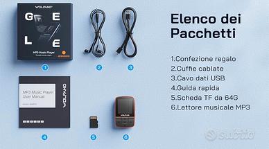 Vendo fantastico lettore MP3 nuovo, mai utilizzato. La confezione include una scheda SD da 32GB