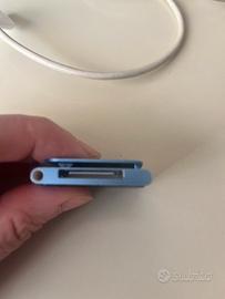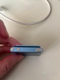 Lettore mp3 - Apple iPod Nano di sesta generazione, originale Apple, colore turchese azzurro, per ascoltare musica e radio - con schermo touch. Munito di cavo che, come si vede in foto, ha attacco "grande" - modello vecchio, per collezionisti. Non ho più modo di attaccarlo alla corrente perché ora i cavi sono piccoli... comunque, funzionante, comodo, bellissimo e stiloso. Design: Presenta un fattore di forma quadrato e compatto, privo della classica rotella cliccabile, sostituita da un display multi-touch. Funzionalità: Include una clip posteriore per fissarlo ai vestiti e spesso veniva utilizzato come orologio da polso con cinturini dedicati. Caratteristiche tecniche: Dispone di radio FM integrata (necessita di cuffie cablate come antenna) e contapassi.