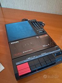 Lettore per audio audiocassette con custodia - Philips. Registratore a cassette portatile "shoebox" introdotto negli anni '80. È noto per essere un modello "computer compatible", spesso utilizzato all'epoca per caricare e salvare dati su computer vintage come lo ZX Spectrum o i sistemi MSX. Dispone di tre potenziometri lineari a scorrimento per regolare separatamente Volume, Alti (Treble) e Bassi. Include un controllo rotativo chiamato "Variable Speed Control" (o pitch control) che permette di regolare la velocità di riproduzione del nastro. Possiede un microfono incorporato e tasti meccanici standard per la registrazione e la riproduzioneSul lato sono presenti ingressi per microfono esterno, cuffie, linea e un altoparlante esterno. Può funzionare sia tramite cavo di alimentazione CA che con sei batterie di tipo C.