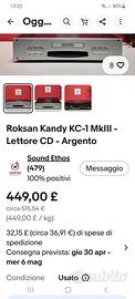 Causa esubero vendo ottimo lettore inglese Roksan kandy mk3 completo di telecomando originale in perfette condizioni statiche e funzionale. Lettore di fascia media/alta tutto in metallo dal suono eccezionale molto analogico e dettagliato. Ottime recensioni in rete, da provare senza problemi.