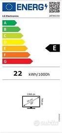 Monitor TV HD Ready LG 28TN515V-PZ. TV e monitor: l'accoppiata vincente. Il monitor TV LG è un prodotto unico, che combina le funzionalità di un monitor PC alle potenzialità di un TV dotato di sintonizzatore Digitale Terrestre T2 e Satellitare S2 integrato. La risoluzione in HD esalta la qualità delle immagini grazie alla precisione cromatica, al contrasto visivo e nitidezza sorprendenti. La risoluzione HD del monitor TV di LG regala immagini realistiche con una straordinaria precisione cromatica. Le immagini vengono proiettate in maniera eccellente, sia guardandole da seduti che stando in piedi. Quando vuoi goderti un bel film, la funzione Cinema Mode ti consente di non perderti nemmeno un fotogramma, anche in caso di scene particolarmente scure. Goditi un ambiente di gioco professionale in grado di offrirti varie funzionalità, come il Black Stabilizer che ti aiuta a individuare i nemici nelle aree più scure dello schermo e la modalità DAS in grado di prevenire l'effetto di ritardo nei giochi più dinamici. Modalità Hotel. Consumo energetico annuo: 22 kWh