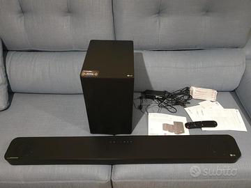 LG SP8YA Soundbar TV 440W 3.1.2 Canali Meridian con Subwoofer Wireless, Bluetooth, Tecnologia DTS:X, Dolby Atmos, Digital, Audio Alta Risoluzione, AI Sound Pro, Ingresso Ottico, USB, HDMI in/out. -SUONO SURROUND: Con audio a 3.1.2 canali, potenza di 440 W e subwoofer wireless, la Soundbar LG SP8YA riempie la stanza con il suono surround cinematografico di ultima generazione; sistema audio potenziato fino a 5.1.2 canali grazie alla connettività wireless -HIGH RESOLUTION AUDIO: La Soundbar ti regala un audio ad alta risoluzione potente e coinvolgente, con frequenze di campionamento a 96kHz e profondità a 24bit per un suono preciso e un’esperienza di ascolto piacevole -TV SOUND MODE SHARE: Sfrutta al massimo il Processore di Intelligenza Artificiale del TV LG per rendere più nitido e uniforme tutto quello che senti; l'audio adattivo si serve di un algoritmo per ottimizzare il suono a seconda del genere -AI ROOM CALIBRATION: Rileva la configurazione ottimale nei tuoi spazi e corregge le distorsioni del suono provocate dagli oggetti nella stanza in soli 15 secondi -DOLBY ATMOS E DTS X: Ti immergono nel suono per regalarti un’esperienza audio ancora più realistica; tutti i tuoi film e la musica prendono vita con un audio più nitido e coinvolgente che mai -GAMING: Dolby Atmos trasforma l’audio dei tuoi giochi proiettando in modo accurato i suoni tutto intorno a te per offrirti un'esperienza di gioco immersiva in 3D -CONTROLLO INTUITIVO: Sfrutta le funzioni sviluppate per garantire un livello di compatibilità eccezionale: puoi controllare la potenza, il volume e anche le modalità audio della soundbar usando solo il telecomando TV LG. Come in foto riceverete la scatola originale con tutti gli accessori originali e cavi e manuali. Ottima per TV LG Oled serie C1/C2 o G2/G3. Per Console PS5 o Xbox Series X o Nintendo Switch 2. Tutto in ottime condizioni e perfettamente funzionante. Per ulteriori informazioni scriveremi.