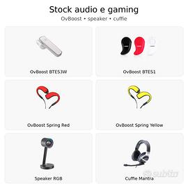 Vendo materiale elettronico e gaming a prezzo molto basso, ideale per rivenditori, negozi, mercatini e vendita online. Disponibili i seguenti articoli: Speaker Bluetooth portatile MP3 Ovboost SPMCBI bianco €2 Speaker Bluetooth portatile MP3 Ovboost SPMCBI rosso €2 Auricolare Bluetooth OvBoost BTES3W con microfono jackless bianco V4.1 €2 Auricolare Bluetooth OvBoost BTES1 con microfono V4.1 nero/rosso/bianco €2 Auricolari sport Bluetooth Ovboost Spring gialli €2 Auricolari sport Bluetooth Ovboost Spring rossi €2 Cuffie gaming Cortek X1PRO USB 3.5 con adattatore e luce RGB €7 Cuffie gaming nere 3.5 mm jack + 2 adattatori + USB Frozen version €7 Cuffie gaming nere 3.5 mm jack + 2 adattatori + USB red light €7 Speaker OvBoost USB 2.0 RGB SPRGB1 €7 Speaker OvBoost USB 2.0 RGB SPRGB2 €7 Altoparlante wireless per doccia Ovboost BW-201 HappyBeach €10 Casse Atlantik Speakers USB 2.0 nere 2W x2 €10 Microfono gaming Gammec con luce RGB USB €11 Microfono di alta qualità per interviste, nascosto, jack 3,5 mm per cellulare €12 Spadar Speaker Bluetooth 4.0 NFC waterproof Adventure arancione €12 Ovboost Atragon mini sistema audio 2.1 con attacco USB €15 Speaker Ovboost BW-103 waterproof Bluetooth 4.0 con microfono €15 Cuffie Mantra Gaming alta fedeltà 3D surround, ANC, 4 equalizzazioni €20 Sistema audio Zeta mini 2.1 con attacco USB €25 MAONO AU903-S Studio-Quality USB Microphone €40 Impianto audio 2.1 per film, musica e gaming €50 Vendita preferibilmente in blocco o in lotti multipli. Prezzi ottimi per rivendita. Contattami per quantità disponibili e acquisto stock.